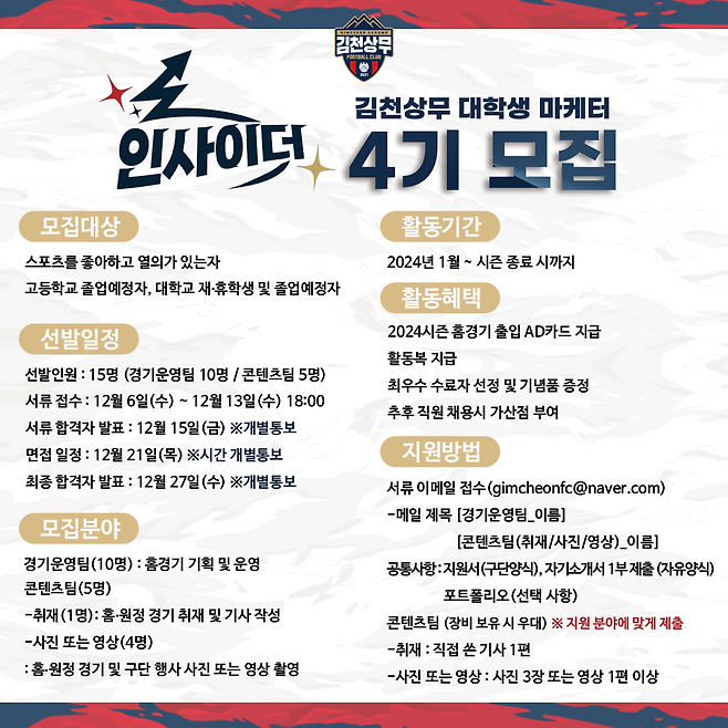모집 기간은 12월 6일(수)부터 13일(수) 오후 6시까지다. 경기운영팀, 콘텐츠 팀으로 나눠 모집하며 공통적으로 지원서(구단 양식)와 자기소개서(자유 양식)를 제출해야 한다. 콘텐츠 팀의 경우 지원 분야에 맞게 기사 1편, 사진 3장, 영상 1편을 추가 제출해야 한다. 서류 접수는 구단 공식 이메일(gimcheonfc@naver.com)로 가능하다.