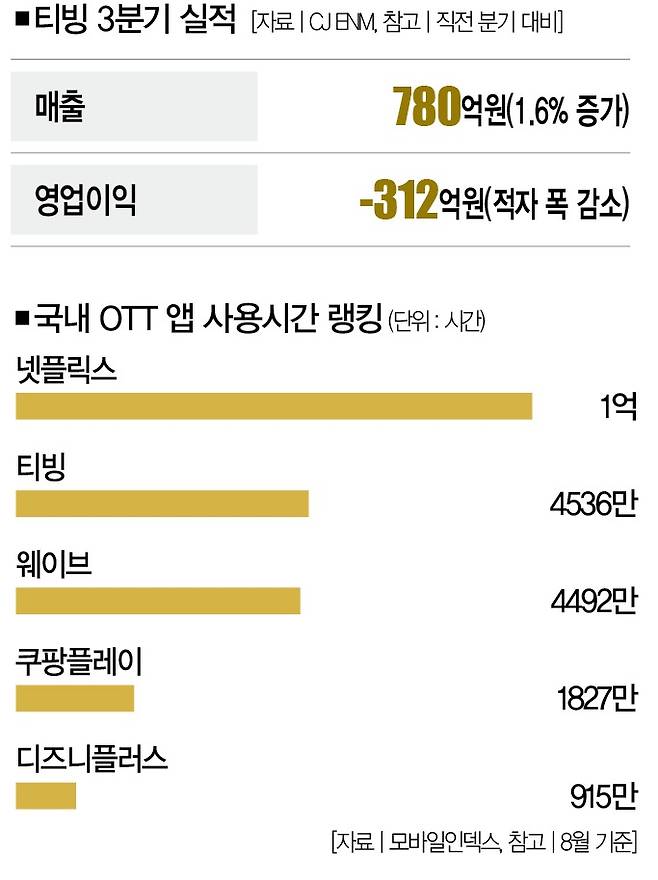 의외의 실적을 기록한 건 티빙이었다. 티빙의 3분기 매출과 영업손실은 각각 780억원과 312억원이었다. 직전 분기와 비교해 매출은 증가했고, 적자 폭은 줄었다(2분기 매출 767억원, 영업손실 479억원). 비결은 유료 가입자의 증가에 있었다. 줄곧 적자 폭이 커져 왔던 티빙이 수익성을 개선하자 CJ ENM을 바라보는 증권가의 태도가 180도 달라졌다.