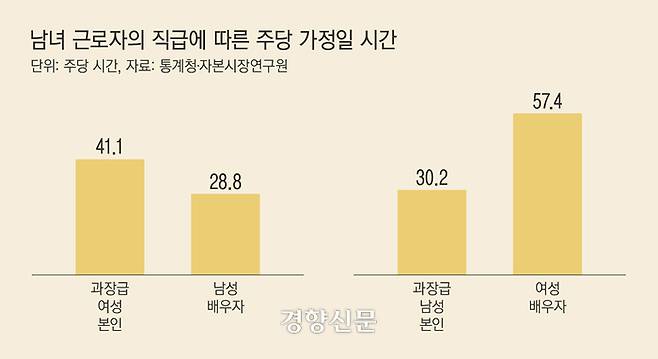 지난해 통계청 조사 결과 전 직급에서 남성 근로자는 돌봄과 집안일을 하는 시간이 아내의 절반 수준에 그쳤다. 과장급 남성 근로자는 가정일에 주당 30.2시간을 쓰고 여성 배우자는 2배에 가까운 57.4시간을 집안일과 돌봄에 썼다. 반면 과장급 여성 근로자는 본인이 41.4시간을 돌봄과 집안일에 쓰고, 남성 배우자는 28.8시간을 쓰는 데 그쳐 남편보다 더 많은 집안일을 소화했다. 강소현 자본시장연구원 연구위원은 “돌봄 및 집안일이 남녀 간 균등하게 분담되고 있다고 보기 어렵다”면서 “임원급까지 경력을 쌓아 업무적 성공을 거둔 여성도 마찬가지”라고 밝혔다. 강 연구위원은 “출산과 돌봄으로 인해 포기하는 대가가 커질수록 여성의 출산 결정에 부정적인 영향을 미쳐 저출생 문제를 더욱 악화시킬 가능성이 있다”고 했다.