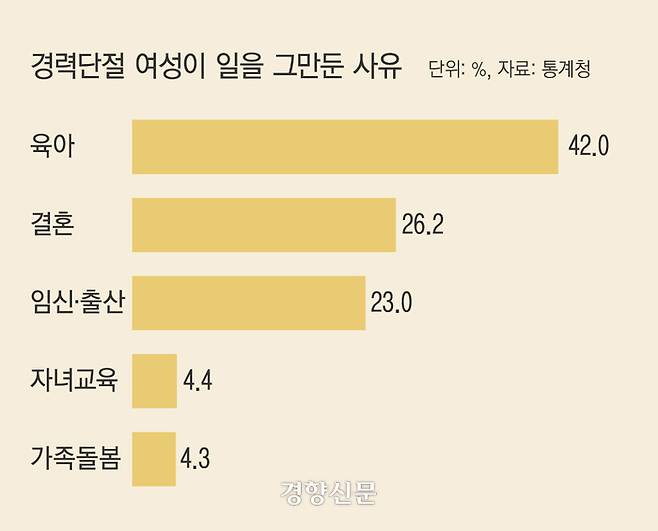 또 여성이 유아기의 한 고비를 넘어도 교육이라는 새로운 벽에 부딪히는 것으로 나타난다. 결혼·출산·육아 등을 이유로 경력이 단절되는 여성은 줄었지만 자녀교육을 위해 직장을 떠나는 경우는 오히려 늘어난 것으로 파악됐다. 통계청에 따르면 올 상반기 경력단절여성은 134만9000명으로 전년 대비 4만8000명 줄었다. 15~54세 기혼여성 중 경력단절여성 비율은 17.0%로 0.2%포인트 하락했다. 경력단절 이유로는 여전히 육아(42.0%)의 비중이 절대적으로 높다. 그러나 지난해와 비교해 육아(-3만명), 결혼(-1만4000명), 임신·출산(-7000명), 가족돌봄(-6000명) 등으로 인한 경력단절 규모는 줄어든 반면 자녀교육은 지난해보다 1만명 늘었다.