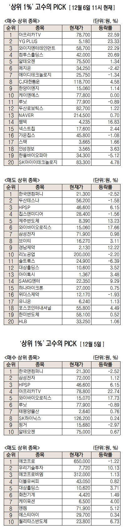이날 미래에셋엠클럽에 따르면 미래에셋증권 주식 거래 고객 중 최근 1개월 간 투자수익률 상위 1%에 해당하는 '주식 초고수'들이 오전 11시까지 가장 많이 사들인 종목은 아프리카TV로 집계됐다.