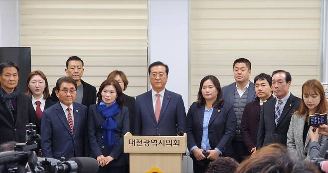 조원휘·이금선 대전시의원과 송재만·이명숙 유성구의원 등 4명의 시·구의원은 6일 오전 대전시의회에서 기자회견을 열고 "저희는 오늘 20년간 함께해온 민주당을 탈당한다"고 선언했다.