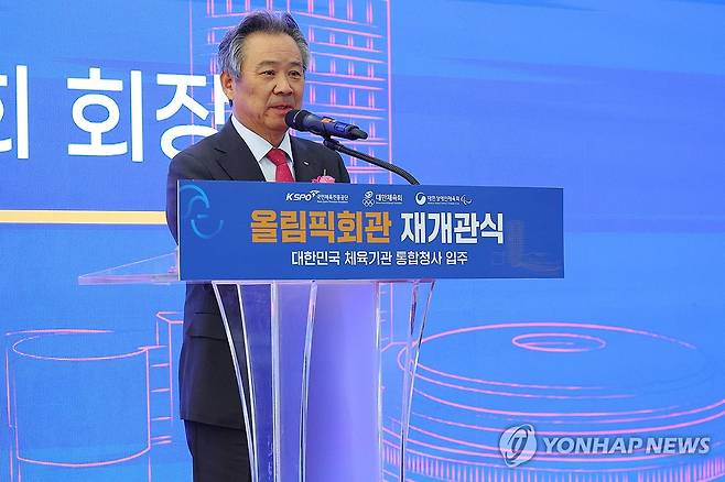(서울=연합뉴스) 김도훈 기자 = 이기흥 대한체육회장이 6일 서울 송파구 올림픽회관에서 열린 재개관식에서 기념사하고 있다.
