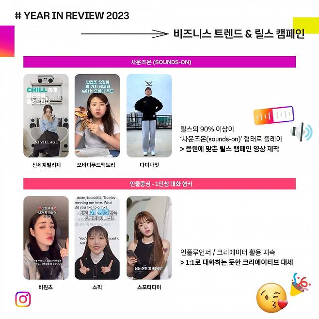 이어 김나영 메타 글로벌파트너십 총괄은 인스타그램 릴스에서 인기 있었던 다양한 콘텐츠를 소개했다. 유머, 동물, 댄스, 푸드, 운동 등 폭넓은 주제가 주목받았으며 그중 큰 화제를 모은 콘텐츠 예시로 스트릿우먼파이터2의 '스모크 챌린지'와 화사의 'I Love My Body 챌린지' 등 댄스 챌린지를 소개했다.