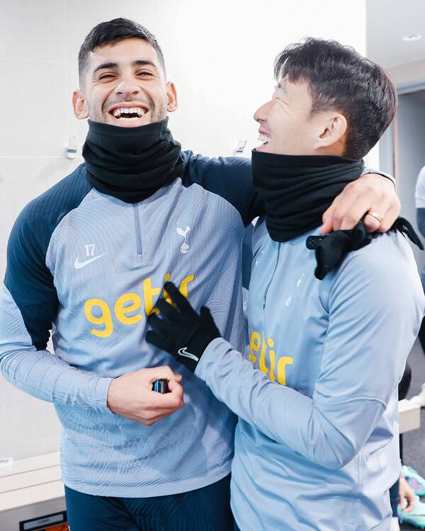 토트넘은 6일(한국시간) 공식 SNS 채널에 손흥민과 로메로가 밝은 표정으로 웃고 있는 사진을 공개했다. 로메로는 최근 퇴장 징계로 경기에 나서지 못했다. 하지만 다가오는 웨스트햄 유나이티드전에서는 뛸 수 있다.