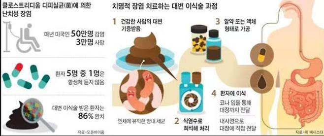 치명적인 설사병인 ‘클로스트리듐 디피실균 감염증(CDI)’은 가장 대표적인 사례다. CDI는 항생제를 잘못 처방했을 때 생기는 병이다. 항생제가 몸 안에 들어오면 장내 유익한 세균이 죽고 디피실균 같은 나쁜 세균이 증식해 극심한 설사를 유발한다. 미국에서만 매년 50만명이 걸리는 병인데, 이 가운데 3만명이 사망할 정도로 심각한 설사병이다. 항생제 치료가 아예 듣지 않는 경우가 많아 환자들은 극심한 고통을 호소한다. 그런데 CDI 환자에게 건강한 사람의 대변을 이식했더니 80~90%가 완치됐다.