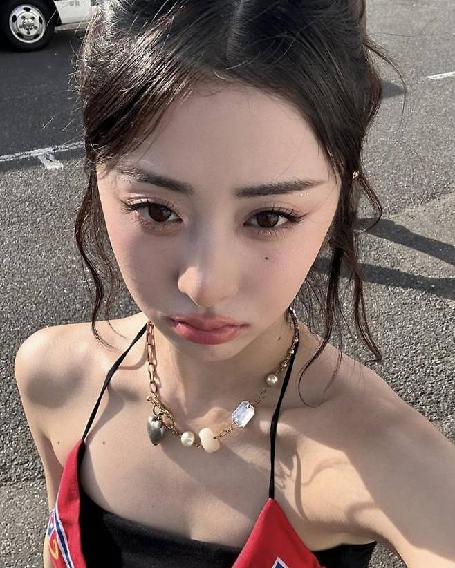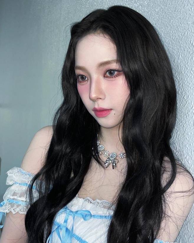 본인의 고유한 색깔이 있는 아이들민니. 밝은 렌즈와 스모키 화장에 오른쪽 눈 밑의 점이 매력적이고 신비로운 그녀의 매력을 더해줘요.