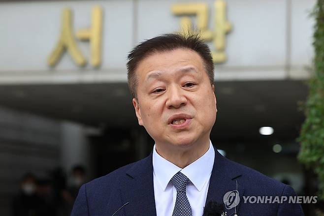 (서울=연합뉴스) 신현우 기자 = 6일 오후 서초구 서울고등법원에서 열린 아이폰 '고의 성능저하' 관련 손해배상 청구 소송 2심을 마친 김주영 법무법인 한누리 대표변호사가 취재진 질문에 답하고 있다.