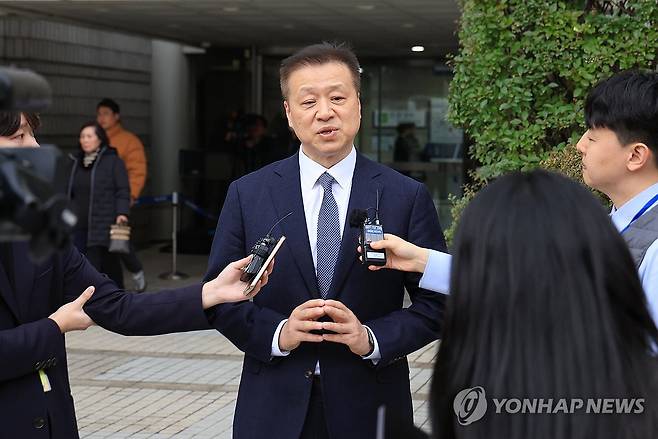 (서울=연합뉴스) 신현우 기자 = 6일 오후 서초구 서울고등법원에서 열린 아이폰 '고의 성능저하' 관련 손해배상 청구 소송 2심을 마친 김주영 법무법인 한누리 대표변호사가 취재진 질문에 답하고 있다.