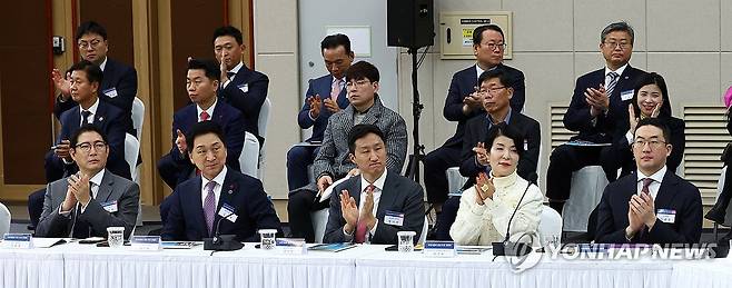 (부산=연합뉴스) 임헌정 기자 = 조현준 효성그룹 회장(앞줄 왼쪽부터), 국민의힘 김기현 대표, 정기선 HD현대 부회장, 박은하 집행위원장, 구광모 LG그룹 회장이 6일 부산항 국제전시컨벤션센터에서 윤석열 대통령이 참석한 가운데 열린 부산시민의 꿈과 도전 격려 간담회에서 박수치고 있다. 2023.12.6 [대통령실통신사진기자단]