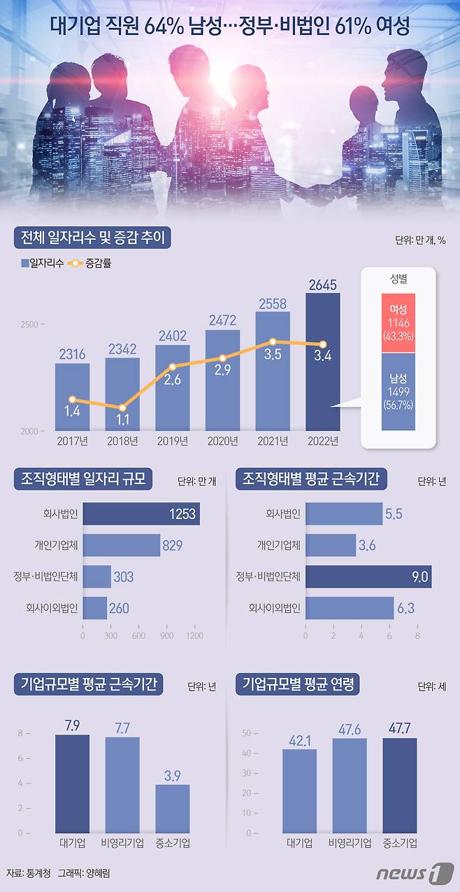 (서울=뉴스1) 양혜림 디자이너 = 지난해 대기업은 남성 일자리가, 정부·비법인단체는 여성 일자리가 더 많았던 것으로 나타났다.