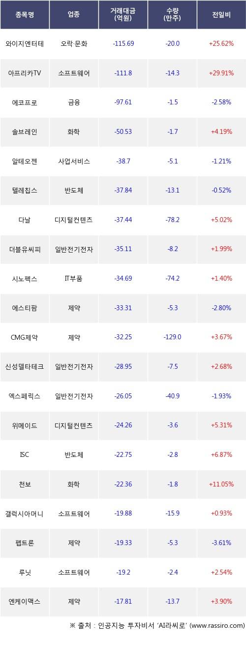 외국인 투자자의 순매도 상위 20개 종목은 와이지엔터테인먼트, 아프리카TV, 에코프로, 솔브레인, 알테오젠, 텔레칩스, 다날, 더블유씨피, 시노펙스, 에스티팜등이다.