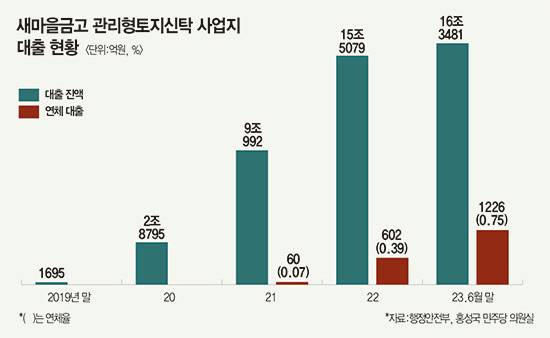 관리형 책임준공신탁은 일반 신탁 대비 보수가 높아 신탁사 입장에서는 효자 상품 노릇을 톡톡히 했다. 금융감독원에 따르면 토지신탁 수탁액은 2017년 56조원에서 지난해 101조5000억원으로 2배 가까이 늘었다. 대부분이 관리형 책임준공신탁으로 파악된다. 관리형 토지신탁의 상당수가 새마을금고에서 이뤄졌다는 점도 우려를 키운다. 행정안전부에 따르면 새마을금고 관리형 토지신탁 사업비 대출 잔액은 2019년 말 1694억원에서 지난해 말 15조5079억원으로 90배 이상 급증했다. 관련 연체액도 2021년 말 60억원에서 지난해 말 602억원으로 10배 늘었다.