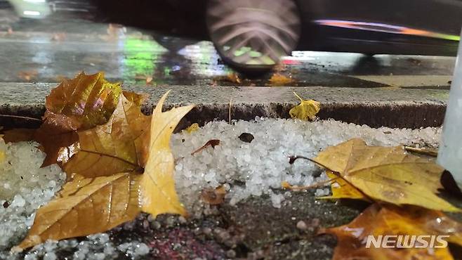 [부산=뉴시스] 권태완 기자 = 6일 오후 부산 부산진구의 한 보행로에 우박이 낙엽과 함께 떨어져 있다. 부산기상청은 이날 구름 내의 강한 상승기류가 만들어지는 지역에서 우박이 떨어지는 곳이 있을 것이라고 전했다. 2023.12.06. kwon97@newsis.com