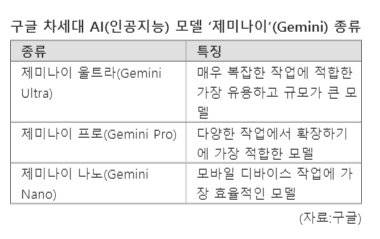 구글은 5일(현지시간) 브리핑을 통해 기존의 구글 최신 대규모 LLM '팜2'(PaLM)를 넘어선 구글이 개발한 가장 포괄적이고 뛰어난 AI 모델 제미나이를 공개했다. 제미나이는 다양한 유형의 데이터·텍스트·이미지, 영상, 코드 등이 학습됐으며 이를 데이터를 멀티 모달(MultiModal·복합정보처리)하는 특징을 가지고 있다.