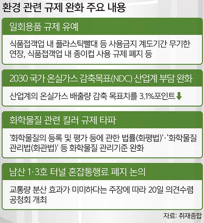 일회용품 규제 완화 외에도 환경 규제를 완화하는 정책이 이어지고 있다. 대표적인 게 기업의 온실가스 감축 부담을 낮춘 2030 국가 온실가스 감축목표(NDC) 발표다. 지난 3월 환경부와 2050 탄소중립녹색성장위원회는 ‘제1차 국가 탄소중립·녹색 성장 기본계획’ 정부 안을 발표하며 이전 정부보다 산업계의 온실가스 배출량 감축 목표치를 3.1%포인트 줄였다. 발표가 나오자마자 환경단체 등은 산업계에 지원책만 제공하는 ‘친기업 정책’이라고 비판했다.