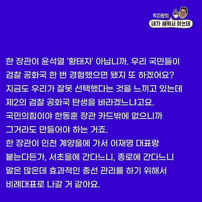 한 장관이 윤석열 ‘황태자’ 아닙니까. 우리 국민들이 검찰 공화국 한 번 경험했으면 됐지 또 하겠어요? 이번 총선은 윤석열 정부의 중간평가 성격이 있을 수밖에 없어요. 지금도 우리가 잘못 선택했다는 것을 느끼고 있는데 제2의 검찰 공화국 탄생을 바라겠느냐고요. 국민의힘이야 한동훈 장관 카드밖에 없으니까 그거라도 만들어야 하는 거죠. 한 장관이 인천 계양을에 가서 이재명 대표랑 붙는다든가, 서초을에 간다느니, 종로에 간다느니 말은 많은데 효과적인 총선 관리를 하기 위해서 비례대표로 나갈 거 같아요.
