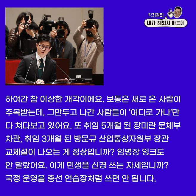 하여간 참 이상한 개각이에요. 보통은 새로 온 사람들이 주목받는데, 그만두고 나간 사람들이 ‘어디로 가나’만 다 쳐다보고 있어요. 또 취임 5개월 된 장미란 문체부 차관이나 취임 3개월 된 방문규 산업통상자원부 장관이나 교체설이 나오는 게 정상입니까? 임명장 잉크도 안 말랐어요. 이게 민생을 신경 쓰는 자세입니까? 국정 운영을 총선 연습장처럼 쓰면 안 됩니다.”