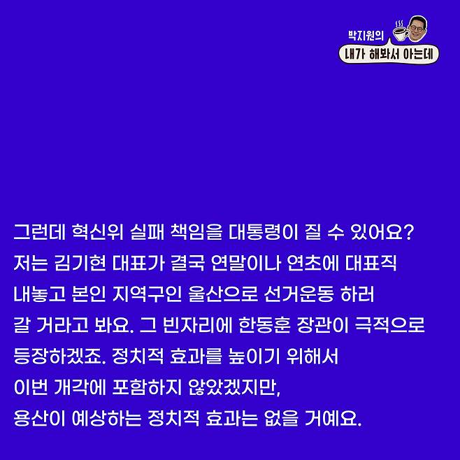 그런데 혁신위 실패 책임을 대통령이 질 수 있어요? 저는 김기현 대표가 결국 연말이나 연초에 대표직 내놓고 본인 지역구인 울산으로 선거운동 하러 갈 거라고 봐요. 그 빈자리에 한동훈 장관이 극적으로 등장하겠죠. 정치적 효과를 높이기 위해서 이번 개각에 포함하지 않았겠지만, 용산이 예상하는 정치적 효과는 없을 거예요.