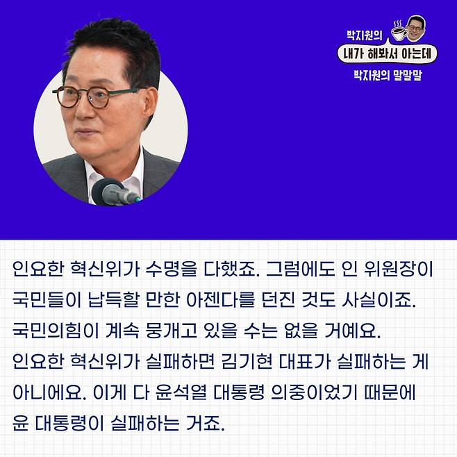 “인요한 혁신위가 사실상 수명을 다했죠. 그럼에도 인요한 위원장이 국민들이 납득할 만한 아젠다를 던진 것도 사실이죠. 국민의힘이 계속 뭉개고 있을 수는 없을 거예요. 인요한 혁신위가 실패하면 김기현 대표가 실패하는 게 아니에요. 이게 다 윤석열 대통령 의중이었기 때문에 윤 대통령이 실패하는 거죠.