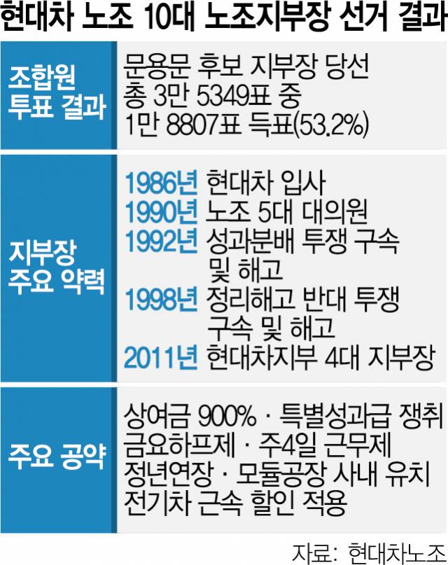 올해 노조 지부장 선거는 강성 성향의 후보자 4명이 경쟁을 벌이며 주목을 받았다. 문 당선인 역시 과거 강경 투쟁을 주도한 이력을 가진 인물이다. 1986년 현대차에 입사한 그는 1992년 성과 분배 투쟁, 1998년 정리해고 반대 투쟁으로 구속 및 해고된 바 있다. 2011년부터 2년간 제4대 지부장으로 재임하면서 총 22차례 부분파업을 벌였다. 문 당선인은 4대 지부장 재임 당시 사측과의 교섭을 통해 45년 만에 밤샘 근무를 없애는 주간 연속 2교대제를 도입했다.