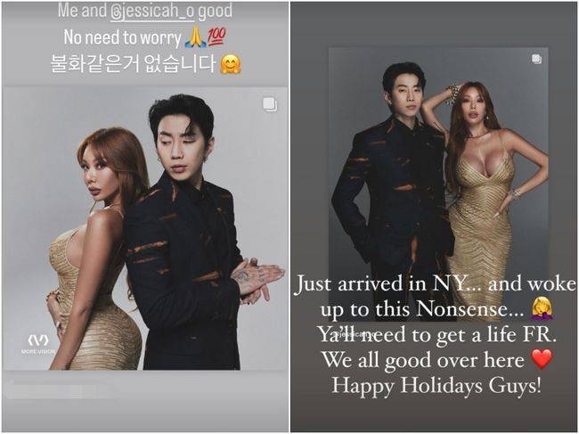 제시 역시 "뉴욕에 방금 도착했다. 터무니 없는 소리에 일어났다. 여러분 똑바로 살아야 할 필요가 있다"며 "(박재범과) 모두 괜찮다. 행복한 휴일 보내시길"이란 메시지를 띄웠다.