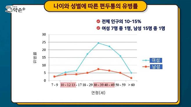그래서 나이와 성별에 따른 편두통 유병률을 다시 한번 살펴보면 전체 인구 중에 10%~15%. 10%만 잡아도 500만 명이 편두통을 1년 동안에 앓은 경험이 있다는 거죠.