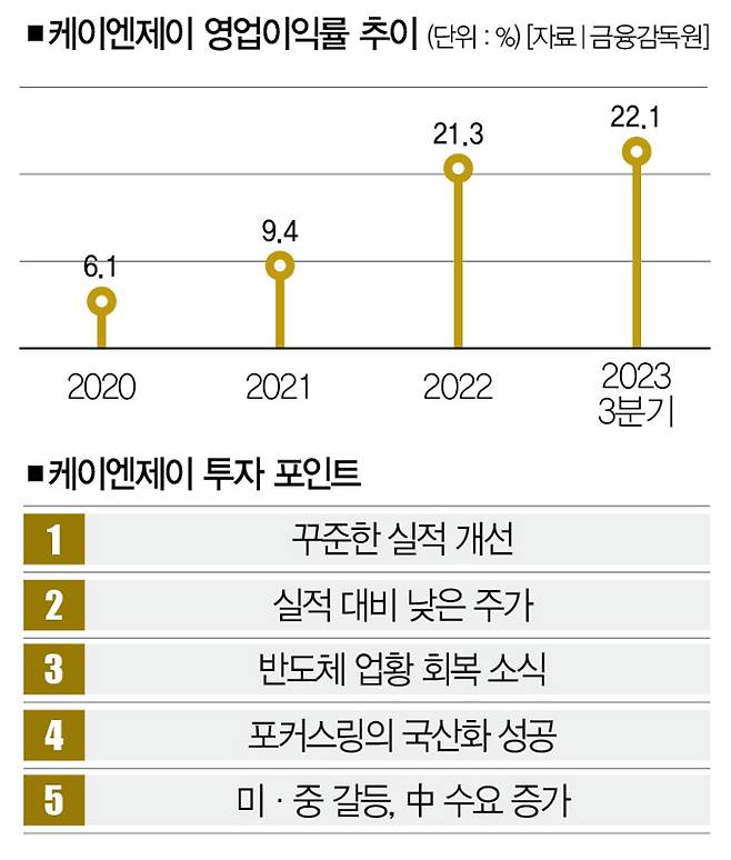 이런 상황에서 케이엔제이의 고대역폭메모리(HBMㆍ인공지능 서버에서 대용량 데이터의 처리 속도를 높여주는 메모리) 관련 수주와 투자가 동시에 늘고 있다. 반도체 업황 개선에 따른 수혜를 직간접적으로 볼 가능성이 높다는 얘기다. 삼성전자나 SK하이닉스가 반도체 생산을 다시 늘릴 때 소재ㆍ부품ㆍ장비 관련 투자가 늘어나면 더할 나위 없다.