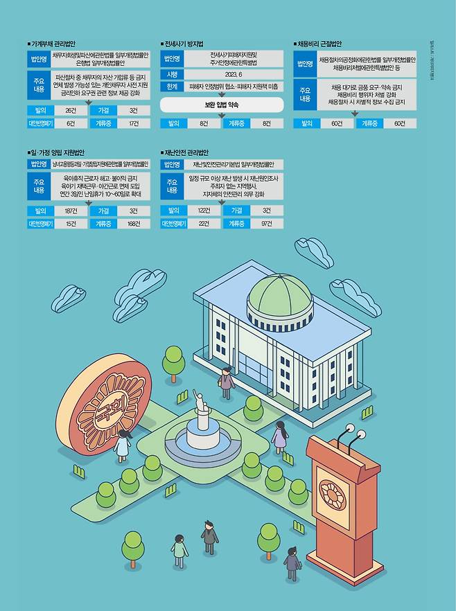 ■ 민생법안➋ 전세사기 = 지난해 초 '전세사기'가 청년층과 서민층을 할퀴었다. 전 재산에 대출까지 끼고 지불한 보증금을 돌려받지 못할 위기에 처하자 몇몇 피해자는 스스로 목숨을 끊었다. 그제야 국회가 움직였다. '전세사기특별법(전세사기피해자지원및주거안정에관한특별법)'은 지난해 5월 국회 문턱을 넘어 6월 1일부터 시행됐다.