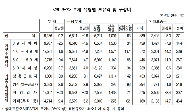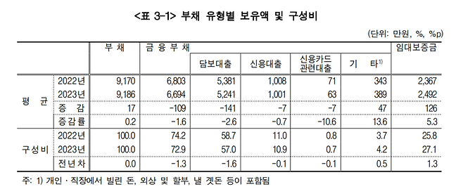 오늘(7일) 한국은행과 통계청, 금융감독원이 공동 조사해 발표한 '2023년 가계금융복지조사' 결과에 따르면, 올해 3월말 기준 가구의 평균 부채는 9천186만원으로, 1년 전보다 0.2% 증가한 것으로 나타났습니다.