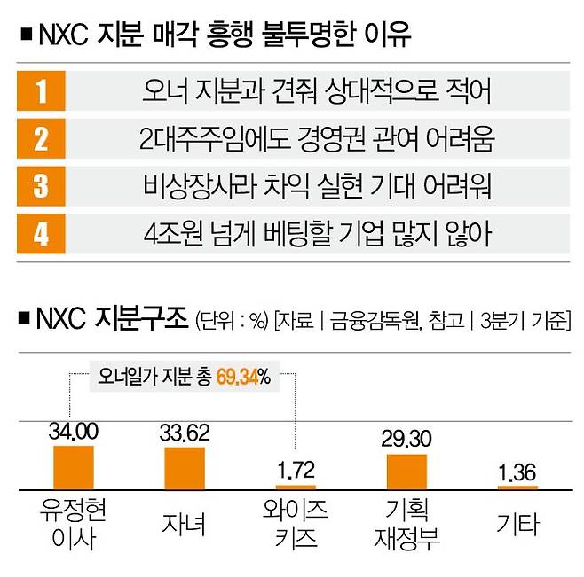 가장 큰 걸림돌은 5조원에 육박하는 NXC 지분 29.3%가 경영권에 영향을 주기 어렵다는 점이다. NXC 지분 총 69.34%를 총수 일가가 보유하고 있어서다. 시장에 나온 지분이 상대적으로 적은 탓에 오너 일가의 지지 없이는 경영 참여가 불가능하다. 더구나 NXC는 비상장사다. 당장 주가 상승에 따른 차익 실현을 기대할 수도 없다.