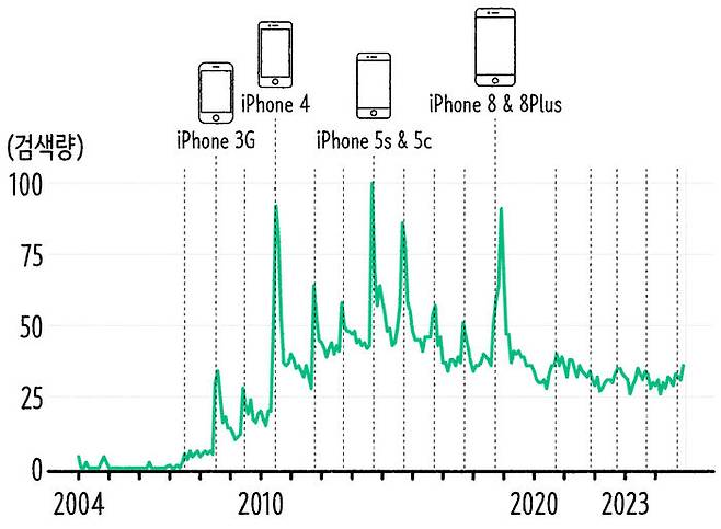신규 모델이 시장에 나오면 자연스레 원래 쓰던 스마트폰에 대한 만족도는 떨어질 수밖에 없을 겁니다. 괜히 내 폰의 속도가 느려 보이기도 하고 말이죠. 실제로 새로운 아이폰이 출시될 때마다 구글에선 'iPhone slow' 검색량이 늘어나기도 합니다�� 위의 그래프를 보면 주요 아이폰 모델이 출시될 때 마다 'iPhone slow'의 검색량이 출렁이는 걸 볼 수 있을겁니다.
