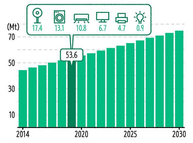 전자폐기물은 크게 6가지(소형 기기, 대형 기기, 온도 교환 기기, IT&통신 기기, 램프, 모니터)로 구분할 수 있는데, 그중에 가장 많은 비율을 차지하는 건 선풍기, 청소기 같은 소형 기기에서 나온 폐기물이입니다. 2019년 기준 소형 기기에서 나온 전자폐기물은 1,740만 톤. 소형 기기 전자폐기물은 2014년 이후 연평균 4%가 넘는 증가세를 보이고 있습니다.