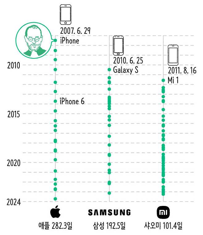 · 스마트폰 신규 모델 발표 주기를 살펴보니 애플은 282.3일, 삼성은 192.5일, 샤오미는 101.4일마다 스마트폰 신규 모델을 발매하고 있습니다.