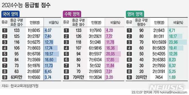 [서울=뉴시스] 7일 교육부와 한국교육과정평가원(평가원)이 ‘2024학년도 수능 채점 결과'를 발표했다. 수험생들은 이튿날인 오는 8일 성적표를 받게 된다. (그래픽=안지혜 기자)