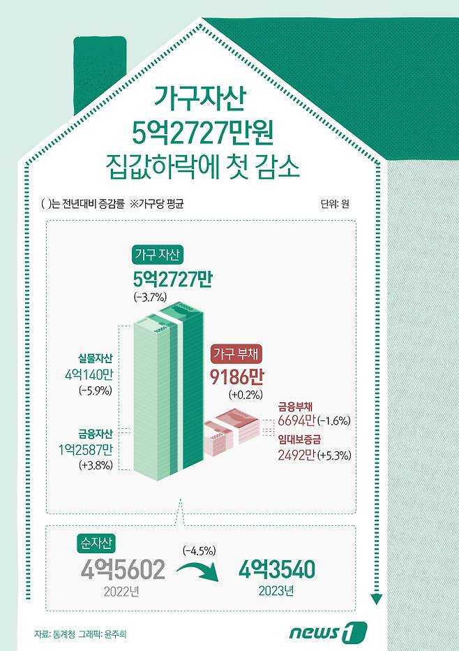 (서울=뉴스1) 윤주희 디자이너 = 7일 통계청·한국은행·금융감독원이 공동 수행한 '2023년 가계금융복지조사 결과'를 보면 올해 3월 말 기준 가구 평균 자산은 1년 전보다 2045만원(-3.7%) 감소한 5억2727만원으로 나타났다. 가구 평균 자산이 뒷걸음친 것은 가계금융복지조사를 시작한 2012년 이후 11년 만에 처음이다. 통계 사상 최초 감소인 셈이다.