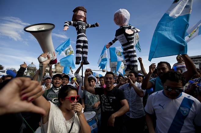 | ▲ 2015년 8월 22일 당시 부패 혐의를 받았던 오토 페레스 몰리나 과테말라 대통령의 퇴진을 요구하는 시위대가 과테말라시티 내셔널 팰리스(National Palace) 앞에서 그의 허수아비(오른쪽)를 든 채 모여 있다. |