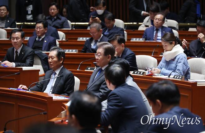 | ▲ 더불어민주당 이재명 대표와 홍익표 원내대표 등 소속 의원이 30일 오후 서울 여의도 국회에서 열린 의원총회에 참석하고 있다. |