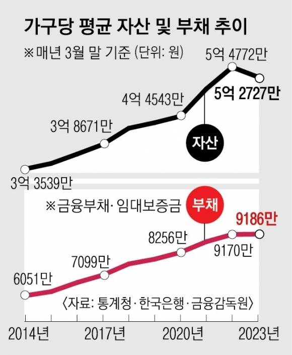 지난 3월 말 기준 가구당 평균 부채는 9186만원으로 지난해 대비 0.2% 증가해 통계 작성 이래 역대 최대 규모로 불어났다.