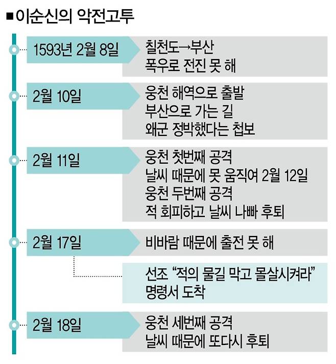 날씨가 좀처럼 받쳐주지 않았다. 부산포로 향하던 조선 연합함대는 거친 날씨 탓에 번번이 바다에서 발이 묶였다. 그럼에도 선조는 '공격하라'는 지령만 내리고 있었다. 자고로 지도자란 현장의 목소리에 귀를 기울여야 한다. 그렇지 않다면 현장에 걸맞지 않은 지시나 명령만 주야장천 하달해 지도자가 되레 '악당(빌런)'으로 전락할 가능성이 높다. 지금 우리의 지도자들은 어떤가.