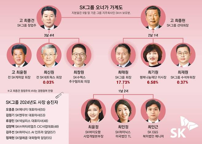고 최종건 SK 창업주는 고 최윤원 전 SK케미칼 회장과 최신원 전 SK네트웍스 회장(71), 최 부회장 등 3남 4녀를 뒀다. 창업주의 동생이자 2대 회장인 고 최종현 선대회장은 최 회장과 최기원 행복나눔재단 이사장(59), 최재원 SK 수석부회장(60) 등 2남 1녀를 뒀다.