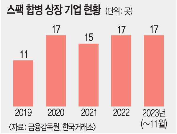 7일 한국거래소에 따르면 올해 스팩 합병으로 국내 증시에 상장한 기업은 17곳이다. 스팩 상장은 연말까지 한 건 더 예정돼 있어 역대 최다 합병 건수를 기록한 2017년(21곳)에 이어 두 번째로 많다.