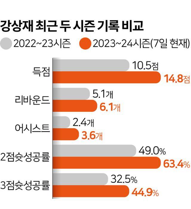 체중 감량에 따른 완벽한 역할 수행은 그의 개인 성적에서도 증명된다. 지난 시즌 평균 10.5점 5.1리바운드 2.4어시스트를 기록했던 강상재는 올 시즌 평균 14.8점 6.1리바운드 3.6어시스트를 올리며 모든 지표에서 눈에 띄는 상승세를 보이고 있다. 슛 성공률 역시 2점슛 49%, 3점슛 32.5%에서 각각 63.4%와 44.9%로 크게 올랐다.