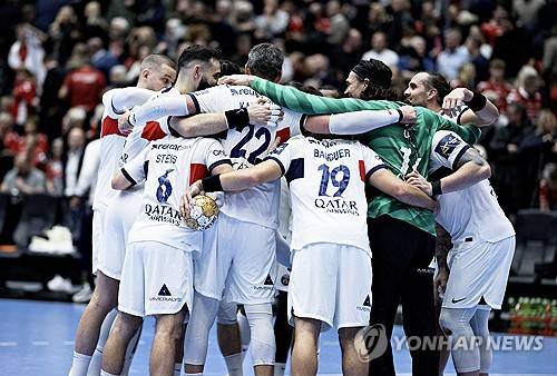 epa11016192 PSGs players celebrates after the EHF Champions League men's handball match between Aalborg Haandbold and Paris Saint-Germain in Aalborg, Denmark, 07 December 2023. EPA/Henning Bagger DENMARK OUT