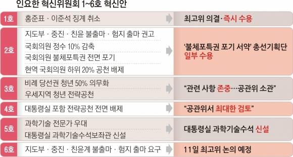 인 위원장 외 11명의 혁신위원도 조기 해산을 수용했다. 다만 혁신위의 공식 해체일은 최고위원회에 이른바 ‘주류 희생 요청안’을 보고하는 오는 11일이다. 백서는 이후 발간한다.