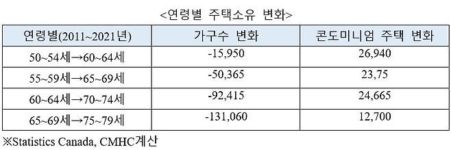 조사결과에서는 캐나다 가구의 주택 선호도가 나이가 들수록 변한다는 결과도 나왔습니다. 나이가 들수록 더 많은 가구가 우리의 분양 아파트와 유사한 콘도미니엄으로 이사했습니다. 그리고 집을 임대하고, 때로는 생활공간을 축소하는 것을 선택했습니다. 그러나 자신의 집을 판매하려는 노인가구가 많지 않은 상황에서 이러한 추세는 당분간 제한적인 범위에서 이루어질 것으로 예상됐습니다.