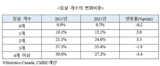 지역별로 차이가 나지만 캐나다의 3대 대도시 중 밴쿠버와 토론토의 가구는 콘도미니엄으로 전환할 가능성이 가장 높았습니다. 몬트리올에서는 노인가구가 임대주택으로 더 많이 이동하는 경향이 있었습니다. 또한 집을 줄여 나가는 비중은 당연히 늘었습니다. 다만 침실 숫자에 따라 차이를 보였습니다. 침실이 1~2개 있는 경우는 오히려 늘었는데 3~4개는 줄었습니다. 특히 4개 이상의 침실을 보유한 가구의 경우는 2011년 30.6%에서 2021년 27.2%로 가장 많이 줄어들었습니다.
