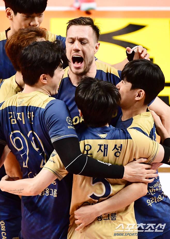 우리카드는 4세트 초반 이상현과 김지한의 블로킹, 마테이의 후위 공격으로 리드를 잡았다. 이후 한성정의 공격과 잇세이, 한태준의 블로킹으로 23-18로 도망갔다. 마테이가 오픈 공격으로 25-22로 세트를 따내며 경기를 마무리 지었다. 장충=최문영 기자 deer@sportschosun.com/2023.12.07/