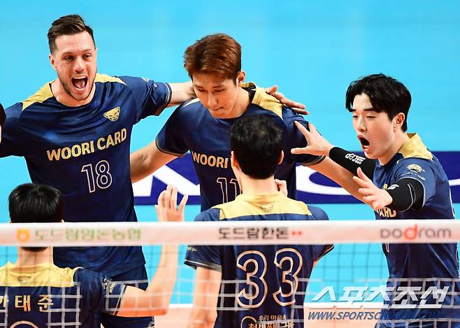 우리카드는 7일 장충체육관에서 열린 대한항공과 대결에서 세트 스코어 3-1(24-26 25-23 25-23 25-22)로 이겼다.