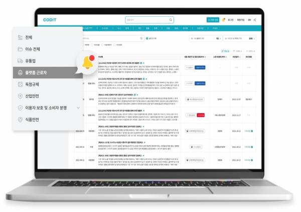 A. 기업 고객 대상 법률와 입법 동향 정보 제공 서비스입니다. 고객이 가입을 하면 이슈를 설정할 수 있습니다. 해당 기업과 관련 있는 것을 세팅하게 돼 있습니다. 관련 내용(입법, 국회 회의록, 정부 SNS 등)이 올라오면 고객사는 알람을 받습니다. 예를 들어 당근 마켓의 경우에는 당근 알바라는 서비스가 있습니다. 당근 알바와 관련된 법안이나 법 관련 이슈를 설정하는 거죠. 직업안정법 등 관련 법안을 모니터링하는 겁니다. 고객사와 상의해서 고객사가 원하는 키워드뿐만아니라 관련 있는 키워드까지 같이 찾아내서 알람이 가능하게 합니다.